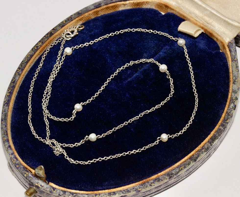 Art Deco Platinum Natural Seed Pearl Station Chain Necklace